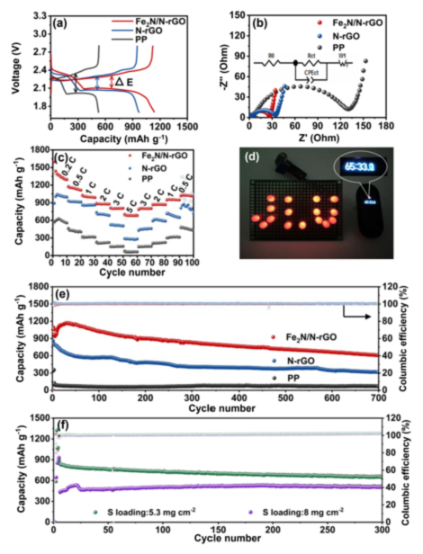 2N/NrGO分離器的電池在0.5 c時恒電流放電/充電曲線(b)不同分離器的電池放電前的Nyquist圖。(c)使用不同分離器的電池的速率性能。(d)由紐扣電池供電的小燈泡在靜置一小時后的亮度圖像。(e)不同分離劑在1℃下的長期循環性能(f)含Fe