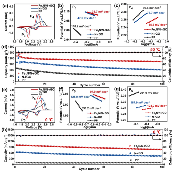 2N在低溫下仍有加速反應動力學,在高溫下仍有抑制多硫化物穿梭的作用。因此,含Fe