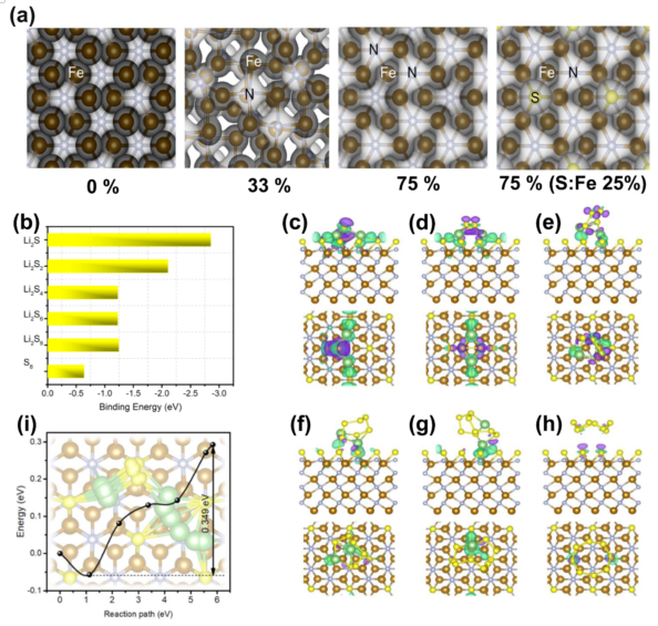 2N作為活性催化位點降低了鋰硫化物的分解勢壘,促進了鋰多硫化物與鋰硫化物之間的轉化動力學,提高了電化學性能。Fe