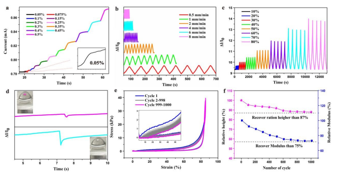 Figure 5. GS-8氣凝膠作為壓阻傳感器的特性:(a) GS-8 氣凝膠在設定應變為2-85% 時的應力-應變(σ-ε)曲線;(b) GS-8氣凝膠傳感器在2-85%的相應設定應變下的I-T;(c) GS-8氣凝膠傳感器在設定應變為2-85% 時的I-V曲線;(d) GS-8氣凝膠傳感器的即時響應,其響應時間為20.86 ms;(e) ΔI/I