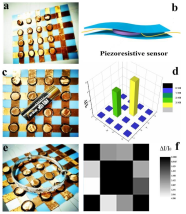 Figure9. 基于GS-8傳感器的功能性壓力傳感陣列:(a)柔性透明基板上的4×4傳感器像素陣列;靈活的4×4 GS-8氣凝膠傳感陣列;(b)傳感陣列結構示意圖 (c, d) 平板感應陣列上的電池和相應的信號輸出;(e-f) 手鐲上的平面感應陣列和信號輸出。