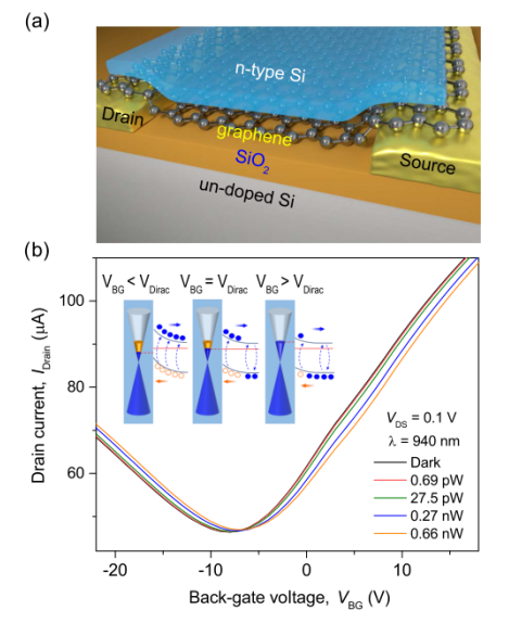 圖 1. (a)用于光電檢測的石墨烯場效應晶體管器件示意圖,顯示了源漏、背柵接觸以及石墨烯和 n 型硅層。 (b)混合Si/Gr光電探測器的電流-電壓特性,有和無照明(λ= 940 nm),室溫下VDS = 100 mV。插圖說明了混合 Si/Gr 結構的能帶示意圖。橙色圓圈表示空穴,藍點表示電子。
