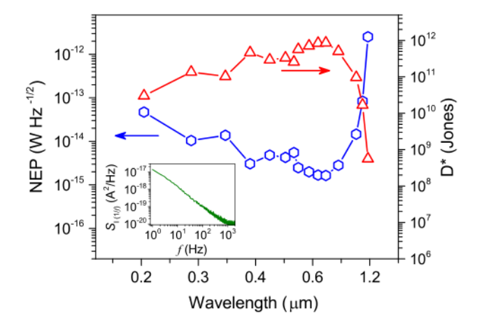 圖5。混合硅/鍺光電探測器的噪聲等效功率(NEP)和比探測率(D*)與光子波長的函數關系。插圖顯示了在V