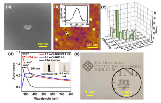 Figure 2. 通過高剪切LPE剝離的NGPs的(a) FESEM和(b) AFM圖像。(c)通過AFM測量的NGP維度的統(tǒng)計結(jié)果。(d)NGP/PAA納米復(fù)合油墨、NGP油墨和PAA溶液的紫外可見光譜。(e)用NGP/PAA油墨在一張普通紙上印刷的圖案。