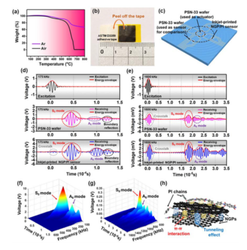 Figure 4.(a)噴墨打印NGP/PI傳感器的熱重分析曲線。(b)噴墨打印的NGP/PI傳感器的光學(xué)照片和經(jīng)過ASTM D3359橫切膠帶測試的膠帶。(c)超聲波采集實(shí)驗裝置示意圖。(d-g)在不同頻率時所捕獲的激勵信號和超聲波信號。(h)打印NGP/PI傳感器的超聲波傳感機(jī)制示意圖。