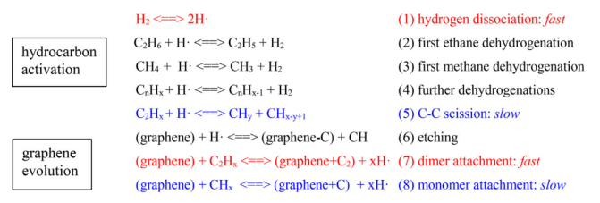 圖2. 說明甲烷(a)和乙烷(b)前體在石墨烯生長中的主要差異:(a)甲烷前體主要產生難移動的CH