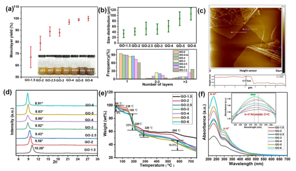 Figure 2. 不同高錳酸鉀/氧化石墨比例下制備GO產物的表征。(a)氧化石墨烯單層的產量。(b)相應的片層尺寸和層數分布。(c)沉積在云母表面上GO-6的AFM圖像。(d)XRD圖譜。(e)凍干GO氣凝膠的TGA分析。(f)GO水分散體的UV-vis光譜。
