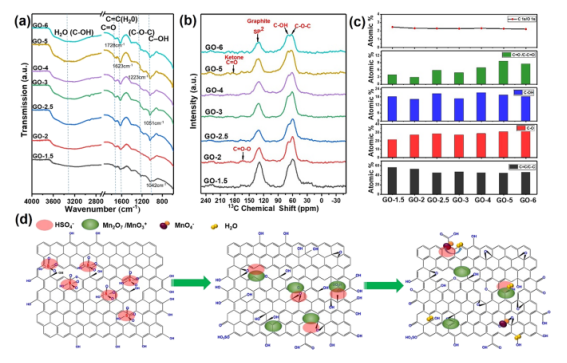 13C 固態核磁共振譜。(c) 基于XPS數據,擬合估算碳官能團的含量。(d) 無水氧化工藝制備GO時,對應的結構轉變示意圖。