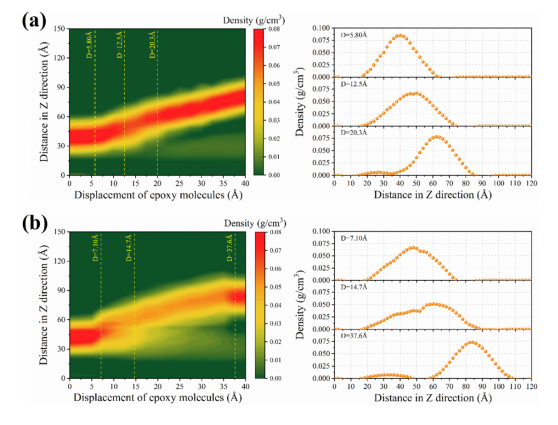 圖4. (a)環氧樹脂-CSH系統和(b)環氧樹脂-GO-CSH系統中環氧樹脂分子的密度等值線圖。