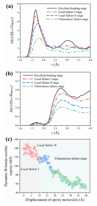 epoxy對的徑向分布函數。(c)SMD模擬期間環氧樹脂分子和GO薄片之間氫鍵的動態數量。