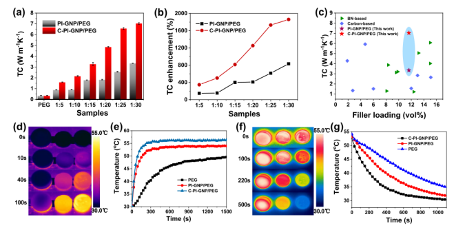 圖3. (a)PI-GNP/PEG和C-PI-GNP/PEG的熱導率和(b)TC增強;(c)導熱系數與報告材料的比較;在加熱和冷卻狀態時的PEG、PI-GNP/PEG和C-PI-GNP/PEG復合材料的(d、f)紅外熱圖像和(e,g)相應的表面溫度變化。