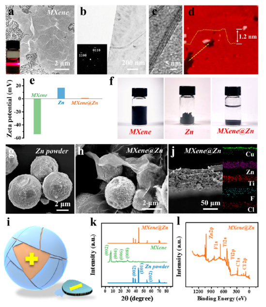 x MXene懸浮液、Zn-p及其混合物放置0.2 h后的數(shù)字圖像。(g) Zn-p和(h) MXene@Zn復(fù)合材料的SEM圖像。(i) MXene@Zn復(fù)合材料示意圖。(j) Cu襯底上MXene@Zn陽(yáng)極的橫截面SEM圖像,以及Cu、Zn、Ti、Cl、F元素的EDS映射。(k) Ti