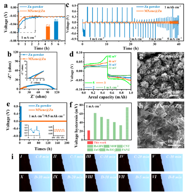 −2。(g)Zn-p電極在循環(huán)后沉積階段的SEM圖像 (h)循環(huán)后MXene@Zn電極在沉積階段的SEM圖像 (i) MXene@Zn電極在2 M ZnSO