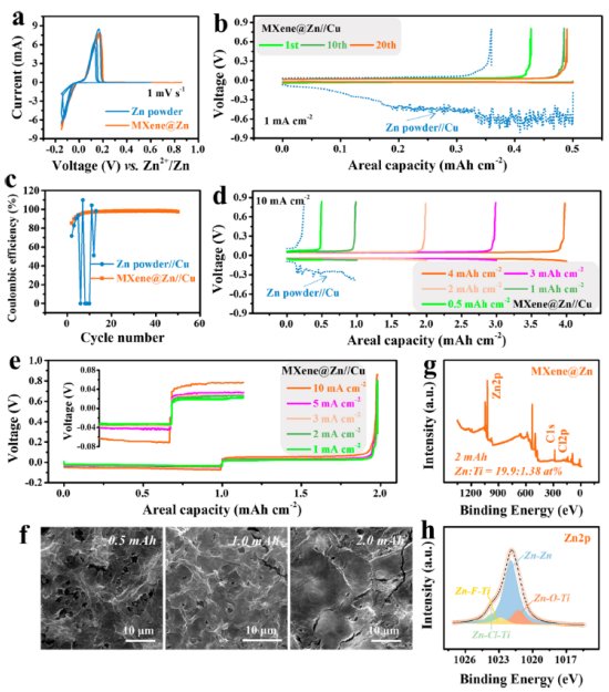 -2的MXene@Zn電極的XPS譜。(h)高分辨率Zn 2p XPS譜。