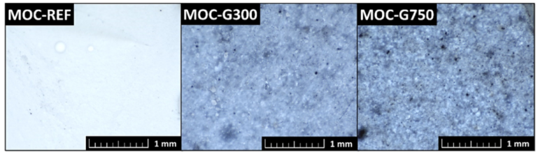 圖4. 養(yǎng)護(hù)14天后制備的樣品照片,從左至右:MOC-REF、MOC-G300、MOC-G750。