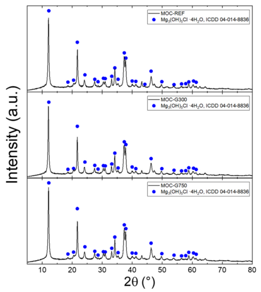 圖6. 樣品MOC-REF、MOC-G300和MOC-G750的衍射圖。