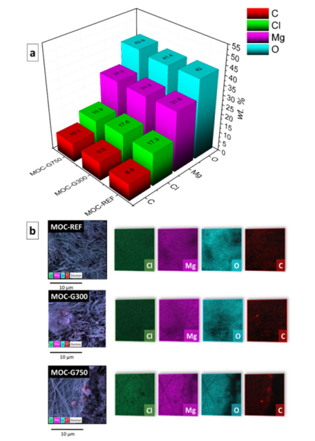 圖12. MOC-REF、MOC-G300和MOC-G750的力學(xué)參數(shù):(A)7天試件的抗壓強(qiáng)度;(B)14天試件的抗壓強(qiáng)度;(C)7天試件的抗彎強(qiáng)度;(D)14天試件的抗彎強(qiáng)度。