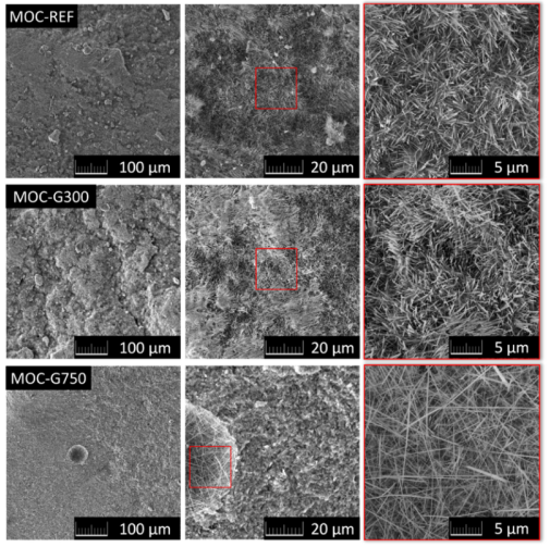 圖8. 用掃描電鏡(SEM)得到的MOC-REF、MOC-G300和MOC-G750顯微圖像。