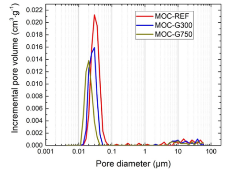 圖11. MOC-REF、MOC-G300和MOC-G750的增量孔體積分布(14天試樣)。