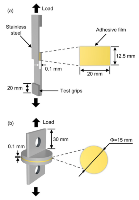 圖1. (a)搭接剪切試樣和(b)粘合拉伸試樣的示意圖。