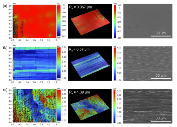 圖2. 三種不銹鋼表面的高度圖、三維剖面圖和相應的SEM圖像。(a)未經處理的鏡面;用(b)1000目和(c)400目砂紙打磨粗糙表面。