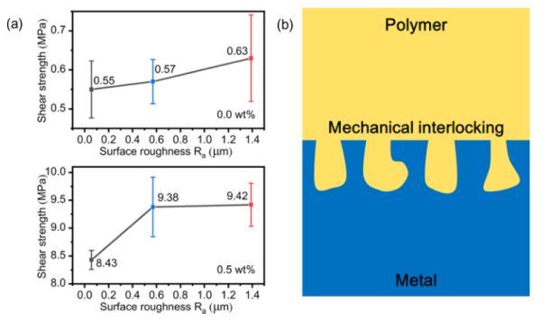 圖3. (a)表面粗糙度對搭接剪切強度的影響;(b)機械聯鎖原理。