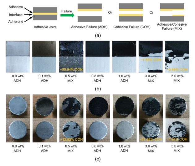 圖7. (a)失效模式示意圖。(b)關于GFs含量的搭接剪切試樣斷裂面圖像。(c) 關于GFs含量的粘接拉伸接頭斷裂面圖像。