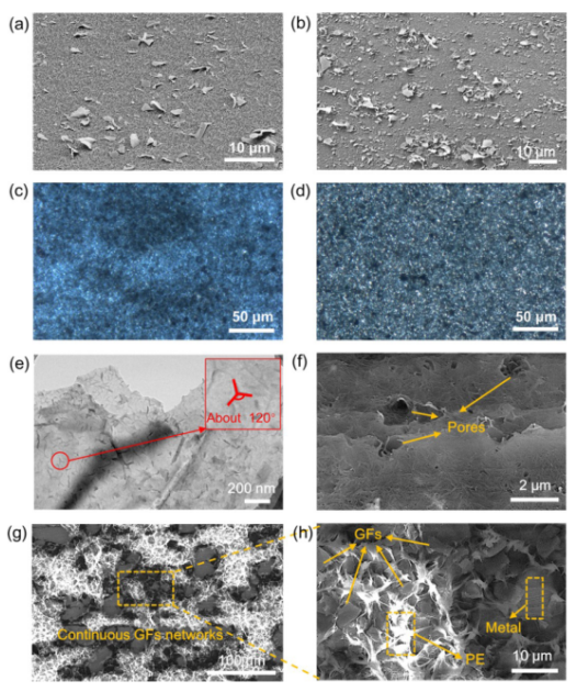 圖9. (a)含3.0 wt% GFs的PE/GFs復合材料和(b)含5.0 wt% GFs的PE/GFs復合材料的蝕刻斷面形貌的SEM圖像。(c)含3.0 wt% GFs的PE/GFs復合材料和(d)含5.0 wt% GFs的PE/GFs復合材料的PLM顯微照片。(e)非共價功能化GFs的TEM圖像。(f)復合材料熔體粘度增加引起的孔隙。(g)和(h)連續GFs網絡結構。