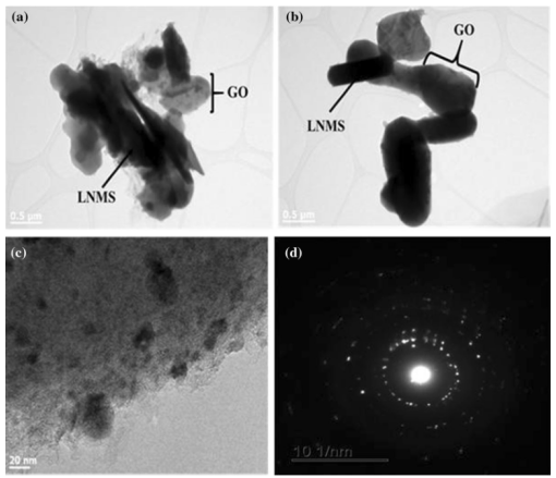 2-G(LNMS-G)、(b)LNMS-G、(c)LNMS-G-PANI的TEM圖像;(d)SAED圖像。