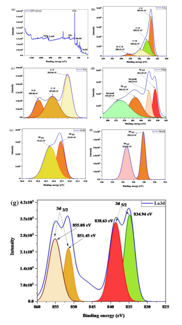 圖7. (a)XPS測量光譜和(b)C1s、(c)N1s、(d)Ni2p、(e)Se3d、(f)Mo3d和(g)La3d的高分辨率XPS光譜。