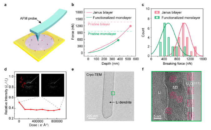 圖3 雙層Janus膜的機械穩性能和電子束電阻。(a) AFM壓痕實驗示意圖。(b)雙層Janus和功能單層石墨烯的典型加載曲線。 (c)雙層Janus和功能單層石墨烯的斷裂力直方圖。(d)雙層Janus石墨烯在電子輻照下的穩定性 (e)雙層Janus石墨烯上Li樹枝晶的低溫透射電鏡圖像。(f)面板e中顯示SEI與Li金屬界面的綠色區域的高分辨率圖像。