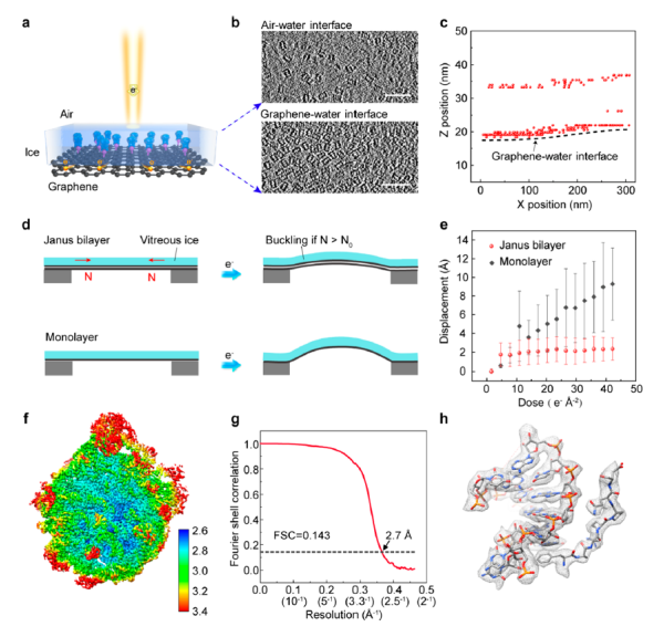 圖4 雙分子層Janus膜用于高分辨率低溫電鏡結構測定。(a)在石墨烯水界面吸附的生物大分子示意圖(藍色)。(b)蛋白酶體顆粒在空氣-水界面(上行)和石墨烯水界面(下行)的代表性冷凍電鏡切片。(c)玻璃化冰中20S蛋白酶體顆粒的空間分布。 (d)雙分子層Janus和單分子層石墨烯上冰膜的屈曲示意圖。 (e)電子束輻射下雙分子層Janus和單層石墨烯上的粒子運動。 (f)重建的50S核糖體的總密度 (g) 50S核糖體重建的傅立葉殼層相關(FSC)圖。 (h)選擇與相應原子模型對接的密度區域。