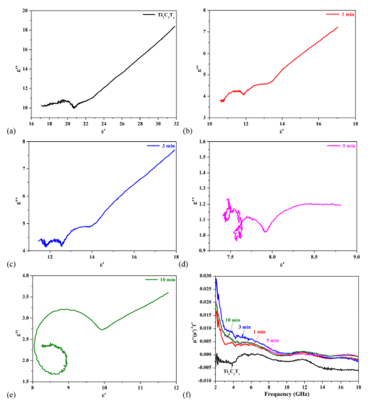 x MXene和氮摻雜產物的Cole Cole曲線和(f) μ″(μ′)−1f−11值。