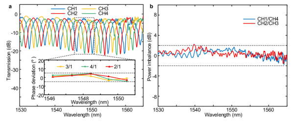 圖2. 90度光混合性能。(a)混合動力中四個輸出端口的測量傳輸。CH表示輸出通道,該數字與輸出端口數字對應。插圖:測量混合動力的相位偏差。(b)測量混合動力的功率失衡。藍線(紅線)表示輸出通道1和4(通道2和3)之間的功率失衡。