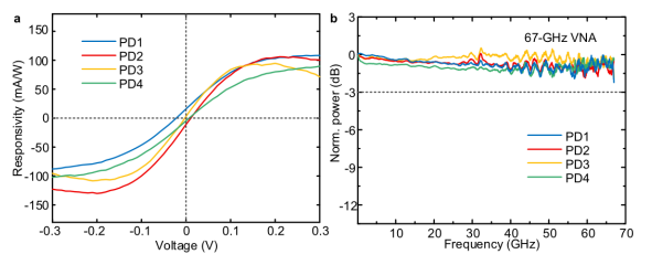 圖3. 石墨烯-PSW PDs的性能。(a)四個PDs在1550 nm處的偏置電壓函數的響應度。(b)四個PDs的頻率響應。VNA:矢量網絡分析器。