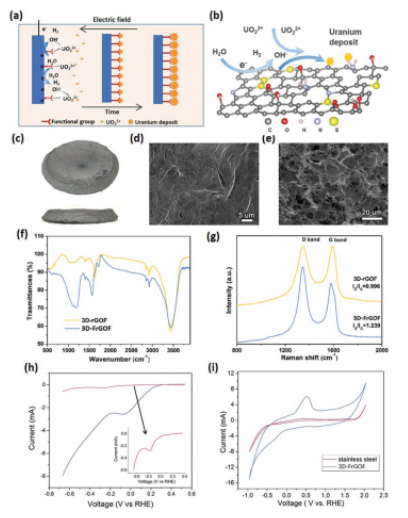 Figure 1. a,b)鈾電解沉積過程示意圖。c-e)3D-FrGOF表面和內部的光學照片和掃描電鏡圖像。f,g)3D-FrGOF和3D-rGOF的拉曼和紅外光譜。h) 3D-FrGOF電極和不銹鋼支架在空白溶液中的極化曲線。i)3D-FrGOF電極和不銹鋼支架在100毫克每升鈾溶液中的CV曲線。