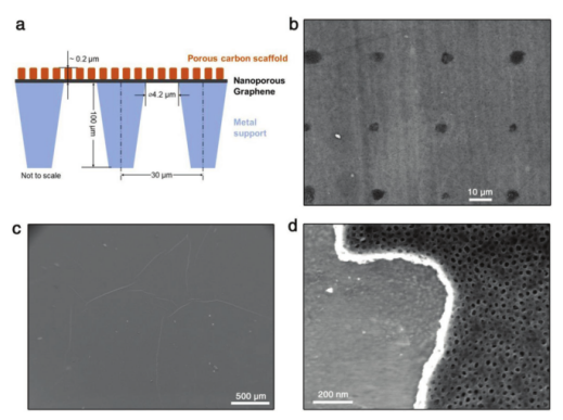 Figure 2. a)最終膜的示意圖。單層石墨烯薄膜的掃描電子顯微鏡(SEM)圖像,分別使用b) 7 kV和c) 2 kV的加速電壓。(b)顯示了放大的SEM圖像,以及(c)顯示了石墨烯膜完好無損。d)多孔碳支架邊緣的俯視SEM圖像。
