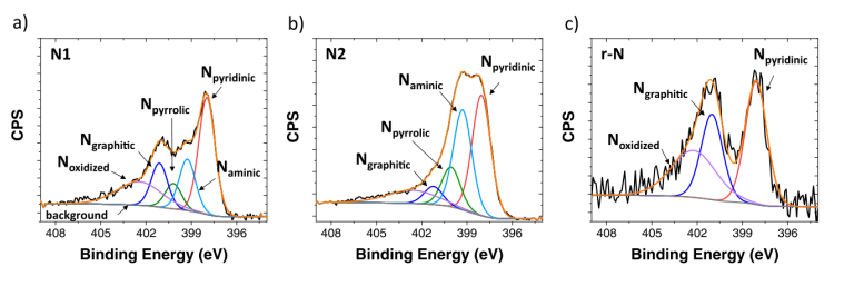 圖1. N-摻雜石墨烯材料的N 1s XPS譜:a) N1;b) N2;c) R-N。