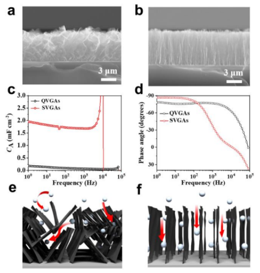 Figure 2. QVGA 和 SVGA的結構和電化學性能比較。a, b QVGA 和 SVGA 的橫截面SEM 圖像。c、d 相位角和面積比電容 (CA) 與頻率的關系圖。e, f離子分別在 QVGA 和 SVGA 中擴散的示意圖。