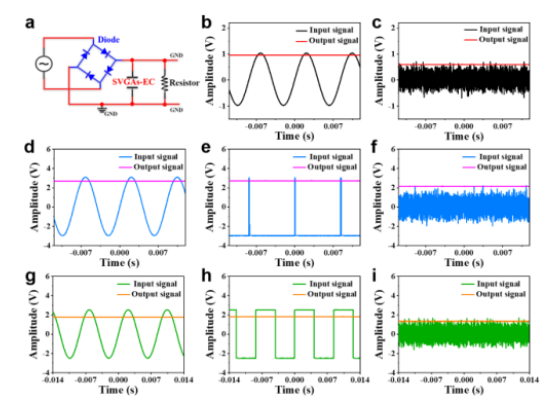 Figure 5. EC-SVGA-2 的過濾性能。a平滑交流信號的電路示意圖。b, c 單個EC-SVGAs在水性電解質中的過濾性能。d-f串聯連接的EC-SVGA 在水性電解質中的過濾性能。g-I 單個EC-SVGA在有機電解液中的過濾性能。