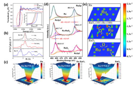 Figure 3.a-c) Ru-RuO2@NPC以及參照樣品的同步輻射數據分析。d) Ru 3p XPS光譜比較,以及(e)相應的表面電荷密度。