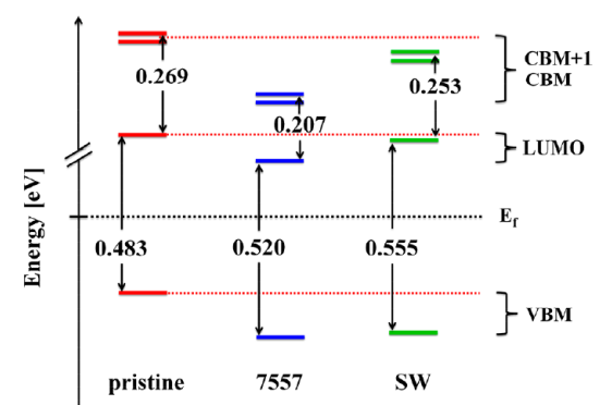 圖1 a (6,5)碳納米管中的7557和SW缺陷b CNT/PDI異質界面光誘導電荷動力學的能級示意圖。