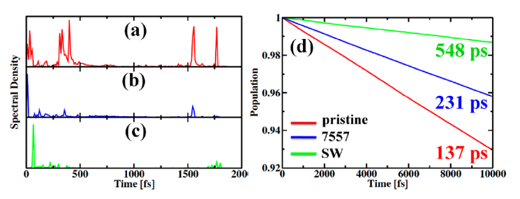 圖5 (a)原始、(b) 7557和(c) SW復合材料中e - h復合動力學中供體和受體之間能隙的傅里葉變換(FTs)。(d)系統的e - h重組。