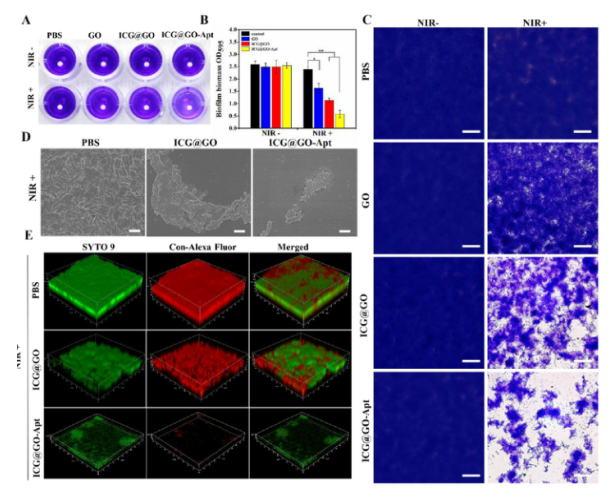 圖 5. 體外抗生物膜活性。 (A、B) 用結(jié)晶紫 (CV) 染色的不同處理生物膜的圖像和通過記錄 CV (595 nm) 的吸光度的 CV 的相應(yīng)定量結(jié)果。 (C) 各自的顯微鏡圖像,比例尺:20 μm。 (D) 在 NIR 照射下用 PBS、GO、ICG@GO 和 ICG@GO-Apt 處理鼠傷寒沙門氏菌生物膜的 SEM 圖像;比例尺2μm。 (E)不同組處理后鼠傷寒沙門氏菌生物膜的 3D CLSM 圖像。