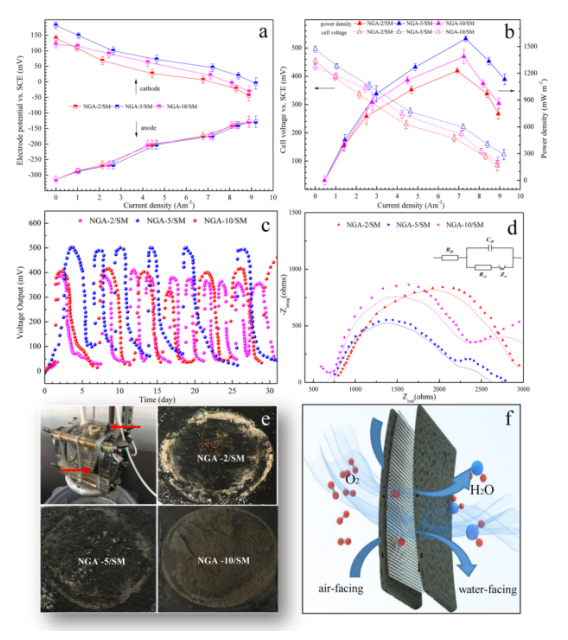 圖 5.(a) 使用NGA/SM陰極的陰極電位比較。 (b) 使用 NGA/SM 空氣陰極的 MFC 的 J-V 曲線和功率密度。(c) 在運行1個月期間,帶有NGA-x/SM 陰極的MFC的電池電壓。 (d) 陰極電位為 0.1 V和 SCE 時 EIS 譜的 Nyquist 圖; 符號代表實驗數據,線代表與等效電路擬合的數據。(e) 運行 73 天后 NGA-x/SM 的面向面的照片。(f) 三相電催化多功能 NGA/SM 的示意圖。
