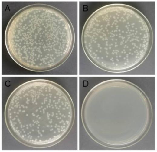 Figure 4.Cu-NPs/ND@G和Cu3/ND@G的抗菌性能。生長抑制試驗(yàn):將不同的材料和菌液涂在LB瓊脂平板上,用大腸桿菌培養(yǎng),分別用用(A)空白、(B) ND@G、(C) Cu-NPs/ND@G和(D) Cu3/ND@G處理,培養(yǎng)條件:37℃和24 h。