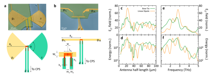 1,2定義了CPD。偽彩色掃描電鏡圖像顯示兩個凝膠滲透色譜。(c,d)天線模擬顯示了對于w = 200 nm,相對于天線尺寸的場增強。(c)在2.8THz照射下,平行于天線軸的電場分量的增強是天線半長的函數(shù)。(d)作為天線半長函數(shù)的能量增強。蝶形天線的能量增強較小(因子2)。(e)作為輻射頻率函數(shù)的能量增強。蝶形天線的百分帶寬為44%,線性偶極天線為12.5%。蝶形天線和線性偶極天線的面內場增強與頻率的關系。(c,d,e,f)中的結果是通過評估當金屬天線在基板上時,對于能量和平面內電場的GFET通道位置中的體積積分而獲得的,并且歸一化為基板上沒有天線的情況。