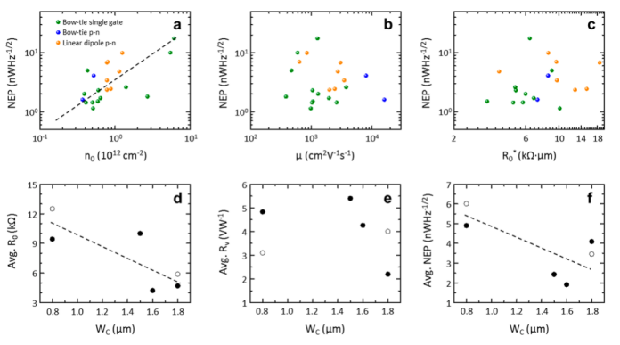 0函數(shù)的NEP(用于空氣側照明)的散點圖。黑色虛線是目標的指南。綠點代表單頂柵 GFET; 黃色(藍色)點表示配備線性偶極(領結)天線的分裂柵 p-n 結。 (b) NEP與u。 (c) NEP與R