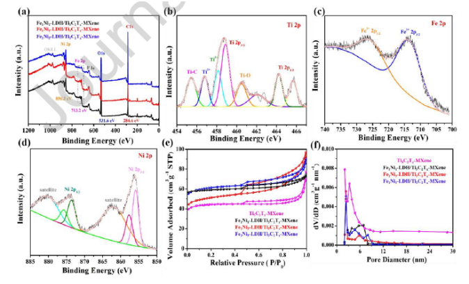 圖3 (a)測量掃描,(b) Ti 2p, (c) Fe 2p和(d) Ni 2p的XPS譜圖。(e) Ti