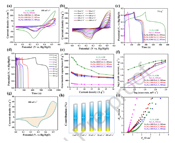 x-MXene納米雜化材料的GCD曲線。(e)特定的電容。(f) b值。(g) 100 mV s